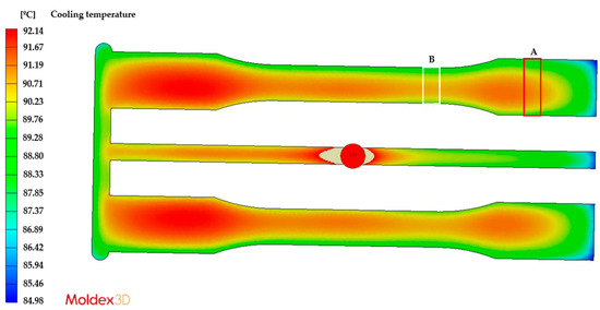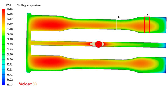 Figure 6 and Figure 7 show the temperature distribution of the injected part for the cooling time established in the analyses, with a mold cooled with cooling liquid at 50 °C and 80 °C, respectively. In both cases, we observed that the highest temperature gradients occurred between both ends of the part, which are equivalent to the residual stress levels shown in Figure 5. However, when comparing Areas A and B in Figure 5, Figure 6 and Figure 7, the temperature differences are a maximum of 1 °C, both for the 50 °C and the 80 °C mold, which indicates a uniform cooling process between these two areas. In other words, the overall cooling of the mold is uniform except for the ends. Therefore, we could say that the mechanism of residual stress formation in this part is mainly flow-induced, which is more evident between Areas A and B in Figure 5.
