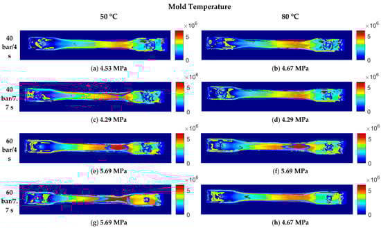 A similar analysis can be conducted by comparing the packing times. However, in this case, when the time is increased, the residual stress is slightly reduced, as observed when comparing the conditions of 40 bar/4 s and 40 bar/7.7 s for a mold temperature of 50 °C (Figure 8a,c). The same happens when comparing 40 bar/4 s and 40 bar/7.7 s, as well as 60 bar/4 s and 60 bar/7.7 s (Figure 8b,d,f,h) for a mold temperature of 80 °C. By contrast, there were no variations when comparing 60 bar/4 s and 60 bar/7.7 s for a mold temperature of 50 °C (Figure 8e,g).