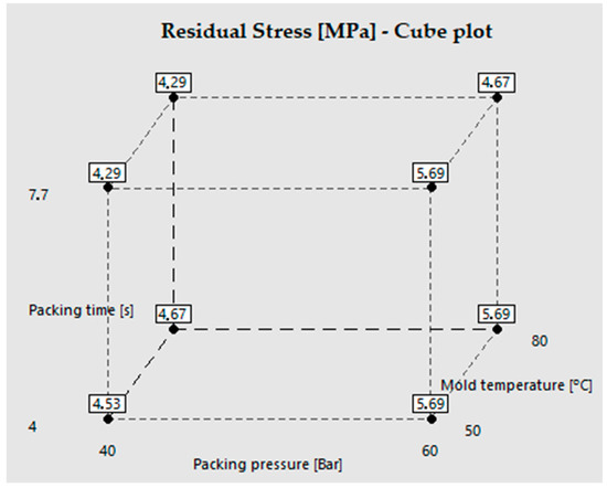 According to the above discussion, we cannot determine the direct effect of each process variable on the residual stresses because multiple factors occur and compete during the injection process. Such factors include: the cooling rate of the material induced by the mold temperature; the internal pressure of the material in the cavity after the packing stage; and the cooling time of the injected part in the mold, which gives way to the differentiated molecular relaxation and the contraction of the material. Based on this approach and the data obtained from the photoelasticity images, the effect of the input variables (mold temperature and packing pressure and time) on the response of the residual stress value was analyzed. This is statistically represented in a 32 factorial analysis of cube plots, principal effects, variable interactions, and Pareto diagrams, which are presented and analyzed below.