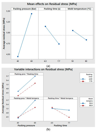 Figure 10 details the effect of the process variables on the residual stresses generated in the injected part. As previously discussed, Figure 10a indicates that the variables with the greatest impact on residual stresses are, in order, packing pressure, packing time, and mold temperature. It is also worth mentioning the interaction between process variables and their effect on residual stress (Figure 10b). Regarding this, we found that the combination of the lowest level of packing pressure (40 bar) with the highest level of packing time (7.7 s) produced the lowest residual stress (4.29 MPa), regardless of the mold temperature. This result could suggest that a longer cooling time in the mold (7.7 s packing + 15 s cooling) favors a higher molecular relaxation, without inducing high molecular orientations by employing a lower packing pressure (40 bar). The interaction of the packing pressure with the mold temperature suggests that, when using the lowest packing pressure level (40 bar), the residual stresses are very similar at mold temperatures of both 50 °C and 80 °C (4.41 MPa and 4.48 MPa); therefore, the impact of the packing pressure is higher.