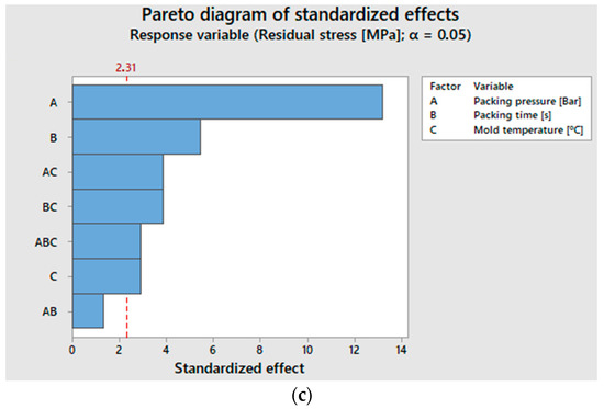 Lastly, Figure 10c shows the variables and interactions that have greater weight in the generation of residual stress. They are, from the highest to the lowest, the packing pressure, the packing time, the packing pressure/mold temperature interaction, and the packing time/mold temperature interaction. The principal effect of the mold temperature has a lower weight, which could be explained by the uniformity of the mold temperature, despite the 30 °C difference between the two temperature levels.