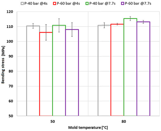 The entire experimental design was subjected to bending tests. Figure 11 presents the summary of results. Regarding the mold temperature, we observed a slightly higher bending strength at the higher mold temperature used (80 °C), which is closer to the temperature recommended for the material [32]. This is explained by the fact that the hotter the mold is, the slower the cooling rate, which favors a more effective application of the packing stage and translates into higher weight and density and less material shrinkage. Likewise, this condition leads to a greater molecular relaxation in the injected material, which reduces the internal or residual stresses that can affect the external load applied during the bending test. Furthermore, applying a greater packing increases the weight and reduces the shrinkage of the injected product, thus improving its mechanical performance. Similar studies also describe a favorable effect of the packing stage on mechanical properties [33,34]. Finally, increasing the cooling time did not seem to significantly influence the mechanical strength of the injected product.
