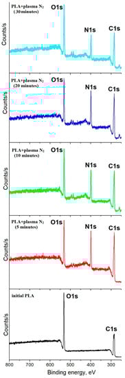 Survey XPS spectra of PLA before and after nitrogen plasma treatment.