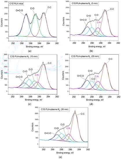 C1s XPS spectra (a) of the initial PLA and (b) PLA after nitrogen plasma treatment for 5 min; (c) for 10 min; (d) for 20 min; and (e) for 30 min.