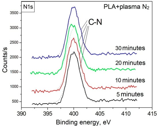 Due to the formation of nitrogen atoms on the PLA surface (according to the results of the survey XPS spectra), elementary components corresponding to the most probable chemical environments of carbon atoms formed during the plasma treatment were introduced to fit the mathematical model. According to the C1s spectra, treatment of the PLA surface with arc discharge nitrogen plasma resulted in the destruction of the polymer chains accompanied by -C-N bond formation with a binding energy of 286.4 eV [,]. The maximum atomic concentration of this bond (15.20 at.%) was observed during the plasma treatment of the PLA surface for 5 min. And the subsequent enhancement of the processing time decreased the -C-N bond content to 12.59 at.% (Table 4). The N1s spectra confirm the -C-N bond formation as well (Figure 5). The total atomic concentration of nitrogen deposited on the PLA surface changed in the same way, which probably resulted from the heating and ablation of the material on the polymer surface when processing for more than 5 min.