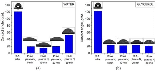 Wettability plays an important role in the biochemical processes that occur on the ostein–liquid border in living organisms. The contact angle of the PLA surface was measured using the sessile drop technique for two liquids: the polar one was water, and the dispersive one was glycerol. Wetting, as a phenomenon occurring when a solid body surface is in contact with a liquid, is characterized by a contact angle θ, whose vertex lies at the three-phase contact point, with one side being the solid–liquid surface and the other side being the tangent to the surface of the wetting liquid []. The initial PLA scaffold contact angles were 121.2° with water and 122.7° with glycerol. Figure 6 shows that the PLA surface modification with arc discharge nitrogen plasma treatment led to a significant decrease in the water and glycerol contact angles. The values decreased to much less than 90° (~20° for both liquids); hence, the surface became hydro- and oleophilic, respectively.