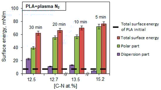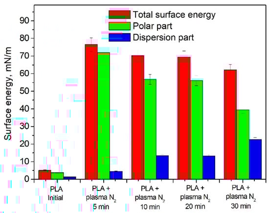 The PLA wettability data reveal a tendency to free surface energy enhancement accompanied by a simultaneous increase in the surface polar and dispersive parts after nitrogen plasma treatment. The maximum surface energy value of 76.53 mN/m corresponds to the PLA scaffolds treated with nitrogen plasma for 5 min (Figure 7).