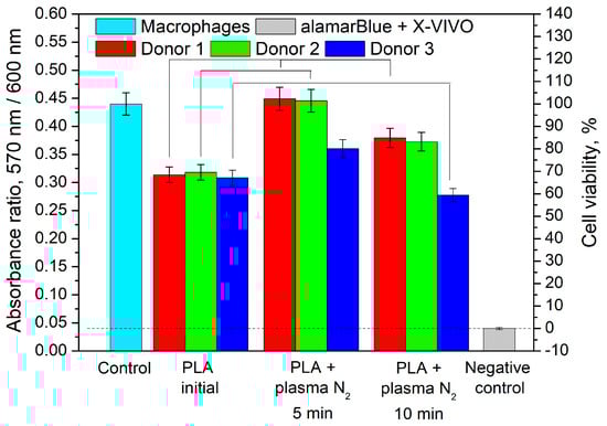 Figure 9 represents the experimental results. We found that the cell viability in the presence of the initial PLA was less than that of the control, but it was much greater than that of the negative control. In the presence of PLA + N2 plasma treatment lasting for 5 min, the macrophage viability of Donor 1 and Donor 2 increased to 101% and 102%, respectively. The cell viability of Donor 3 in this case was higher than that in the presence of the initial PLA. The increased viability compared with that of the initial PLA was observed for the cells of Donor 1 and Donor 2 in the presence of PLA + N2 plasma treatment lasting for 10 min. The negative control value was the background signal and was subtracted from the results.