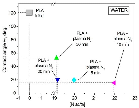 The changes in the chemical and elemental compositions of the PLA scaffolds caused by plasma treatment in a nitrogen atmosphere influenced their wettability characteristics. It was shown that the increasing nitrogen atomic concentration resulted in the water contact angle decreasing. The maximum atomic nitrogen concentration of 25.15 at.% in the PLA surface layer after 10 min of plasma treatment corresponded to the minimal value of the water contact angle equal to 15.4°. However, when the atomic concentration of nitrogen during the 30 min plasma modification decreased, the contact angle value increased again but still remained lower than the initial angle (Figure 10).