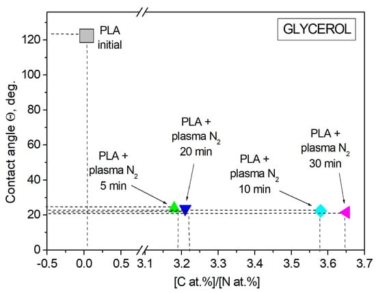 Glycerol is a liquid that has less polarity than water, so the dispersion component of the surface tension of this liquid is more susceptible to change. The atomic ratio of [C, at.%]/[N, at.%] was found to influence the wettability alteration of the plasma-treated PLA scaffolds upon contact with glycerol. The contact angles of the PLA scaffolds decreased when the [C, at.%]/[N, at.%] ratio increased. The minimum value of the contact angle (21.5°) corresponded to the maximum [C, at.%]/[N, at.%] ratio of 3.65 at.% when the PLA was treated with nitrogen plasma for 30 min (Figure 11, Table 3).