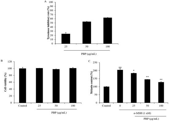 Skin whitening effect of PBP. (A) Tyrosinase inhibitory effect of PBP; (B) cytotoxicity of PBP on B16F10 cells; (C) inhibitory effect of PBP on α-MSH-stimulated melanin synthesis in B16F10 cells. The experiments were conducted in triplicate and the data are expressed as the mean ± SE. * p < 0.05, ** p < 0.01 as compared to the α-MSH-treated group and ## p < 0.01 as compared to the control group.