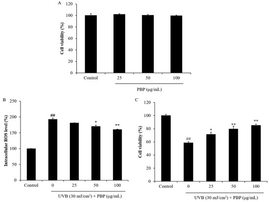 PBP protects HaCaT cells against UVB-induced photodamage. (A) Cytotoxicity of PBP on HaCaT cells; (B) intracellular ROS-scavenging effect of PBP; (C) protective effect of PBP against UVB-induced cell death. The experiments were conducted in triplicate and the data are expressed as the mean ± SE. * p < 0.05, ** p < 0.01 as compared to the UVB-irradiated group and ## p < 0.01 as compared to the control group.