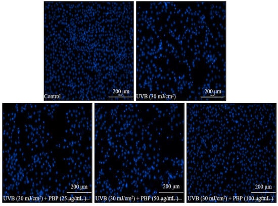 To evaluate the photoprotective effect of PBP on HaCaT cells, HaCaT cells were seeded in a 24-well plate. After 24 h of incubation, HaCaT cells were treated with PBP for 1 h. The PBP-treated HaCaT cells were irradiated with UVB (30 mJ/cm2). To evaluate the intracellular ROS level of HaCaT cells, the UVB-irradiated HaCaT cells were treated with 2,7-dichlorofluorescein diacetate (500 μg/mL, 25 μL/well) for 30 min, and then the fluorescence intensities of HaCaT cells were evaluated. To evaluate the cell viability, the UVB-irradiated HaCaT cells were further incubated for 24 h. After incubation, the MTT solution (2 mg/mL, 25 μL/well) was added to each well, and the cells were incubated for 3 h. Then, the supernatant was removed, and the formazan was dissolved in dimethyl sulfoxide. The apoptosis body formation of UVB-irradiated HaCaT cells was investigated by the Hoechst 33343 assay [34]. The intracellular ROS level and cell viability of the control group were referred to as 100%.