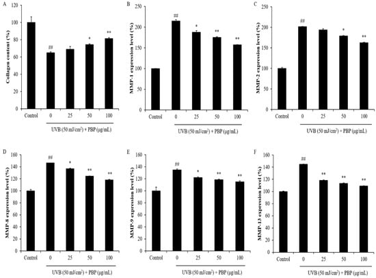 PBP increases collagen synthesis and inhibits MMP expression in UVB-irradiated HDF cells. (A) Collagen synthesis levels in UVB-irradiated HDF cells; (B) MMP-1 expression levels; (C) MMP-2 expression levels; (D) MMP-8 expression levels; (E) MMP-9 expression levels; (F) MMP-13 expression levels. The experiments were conducted in triplicate and the data are expressed as the mean ± SE. * p < 0.05, ** p < 0.01 as compared to the UVB-irradiated group and ## p < 0.01 as compared to the control group.