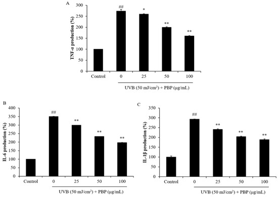 Inhibitory effects of PBP on the expression of pro-inflammatory cytokines in UVB-irradiated HDF cells. Expression of (A) TNF-α; (B) IL-6; and (C) IL-1β. The experiments were conducted in triplicate and the data are expressed as the mean ± SE. * p < 0.05, ** p < 0.01 as compared to the UVB-irradiated group and ## p < 0.01 as compared to the control group.