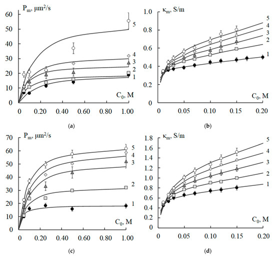 Concentration dependences of integral diffusion permeability (a,c) and specific electrical conductivity (b,d) of MK-40 (a,b) and MA-41 (c,d) membranes, thermostated in distilled water at T = 20 (1), 40 (2), 60 (3), 80 (4), and 100 (5) °C: experimental data (points) and theoretically calculated curves. Pm is integral diffusion permeability of the membrane; κm is specific electrical conductivity of the membrane; C0 is concentration of sodium chloride solution.
