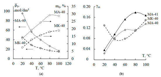 Temperature dependences of the characteristic exchange capacity and the macroscopic porosity parameter m0 (a), and the equilibrium distribution coefficient (γm) of the Na+-Cl− ion pair (b) for the anion-exchange membranes MA-40 and MA-41, and for the cation-exchange membrane MK-40.