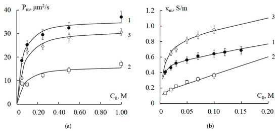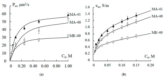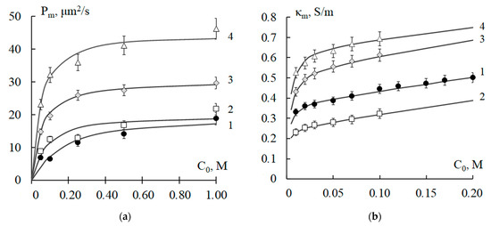 Concentration dependences of the integral diffusion permeability (a) and specific electrical conductivity (b) of the studied membranes, thermostated in distilled water at T = 80 °C: experimental data (points) and theoretically calculated curves. Pm is integral diffusion permeability of the membrane; κm is specific electrical conductivity of the membrane; C0 is concentration of sodium chloride solution.