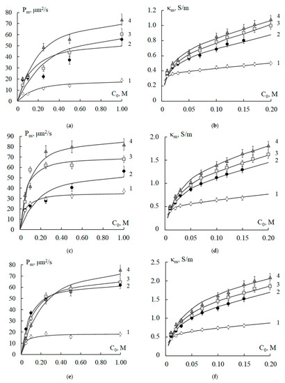 Concentration dependences of the integral diffusion permeability (a,c,e) and specific electrical conductivity (b,d,f) of MK-40 (a,b), MA-40 (c,d), and MA-41 (e,f) membranes conditioned (1) and thermostated in water (2), 5 M NaOH (3) solution, and 2.5 M H2SO4 (4) solution at T = 100 °C for 50 h: experimental data (points) and theoretically calculated curves. Pm is integral diffusion permeability of the membrane; κm is specific electrical conductivity of the membrane; C0 is concentration of sodium chloride solution.