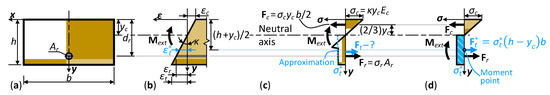- The strain distribution follows the Euler–Bernoulli hypothesis (Figure 1b). Numerous literature sources proved the adequacy of this assumption for RC members (e.g., [42,43]).