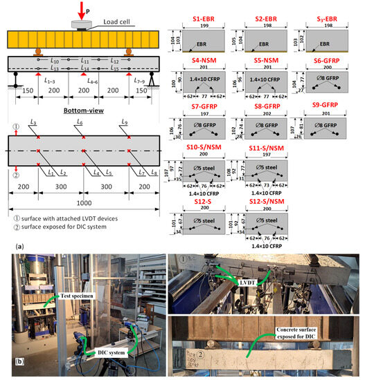Gribniak et al. [20,22] and Sultani et al. [29] established the geometry and the testing layout of the bending samples, following the formation of multiple cracks in a relatively small laboratory sample and thus reducing the discrete cracking effect on the curvature estimation result. Therefore, this study considers the 1000 mm slab-shaped beams loaded in the four-point scheme, as Figure 2a shows. The 200 × 100 mm cross-section was reinforced with near-surface mounted (NSM) strips, embedded bars, and externally bonded reinforcement (EBR) sheets in various combinations. This investigation includes 12 standardized beam samples to illustrate applying the proposed analysis procedure.