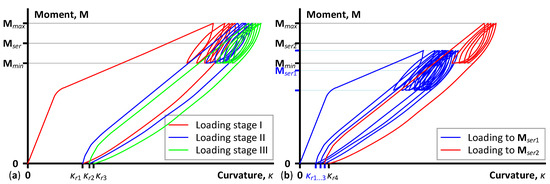 During the physical tests, the loading process starts automatically at 0.4 mm/min until the maximum load of the cycle Mmax (exceeding Mser by 15%). Subsequently, the operator interrupts the loading process when it reaches the upper boundary Mmax, manually reducing the load to the minimum cycle boundary Mmin (corresponding to approximately 85% of Mser). After that, the bending moment rises again under computer control to the maximum cycle load Mmax, continuing the loading cycles. The complete unloading finalizes the first loading stage, resulting in the residual deformation expressed as curvature κr1. Typically, this loading process is repeated three times (with five load cycles in each repetition) with the complete unloading of the beam samples, investigating the residual deformation trends. Each subsequent loading stage starts at the same speed as the previous loading round. However, the curvature analysis accounts for the residual deformations from all past loading stages (κr1, κr2, κr3 …), shifting the curvature diagrams as shown in Figure 3. To determine the loading conditions in terms of the ultimate load Mult, Table 2 uses the following notation: