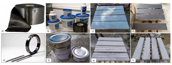 Installing reinforcement systems: (a) CF sheets; (b) epoxy adhesive; (c) prepared surface of specimens; (d) specimen with adhesively bonded CF sheets; (e) S&P C-Laminate CFRP strip; (f) S&P Resin 220 epoxy adhesive; (g) arrangement of the NSM grooves; (h) specimen with embedded CFRP strips. Note: the beam samples are shown in an inverted position to clarify the installation details.