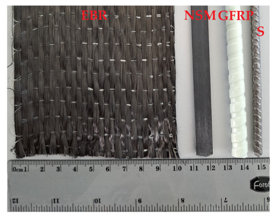 Table 1 describes the beam specimens’ geometry and material properties. In this table, h and b represent the height and width of the cross-section in Figure 1a; d, A, and E are the reinforcement parameters (effective depth, cross-section area, and modulus of elasticity); ft describes the tensile strength of the reinforcement, and the subscripts “1” and “2” correspond to the transformed reinforcement components in Equation 1. Table 1 also shows the compressive strength of the standard ∅150 × 300 mm concrete cylinder (f’c) on the testing day; the column “Age” specifies the testing age. The column “f’c” specifies the average value and standard deviation determined for four identical cylinders; the remaining parameters of the concrete necessary for the analysis (i.e., the modulus of elasticity and tensile strength) were determined using the average compressive strength values (Table 1) and the Eurocode 2 formulas [44]. Gribniak et al. [45,46] proved the adequacy of such an approach for the numerical analysis of RC elements. The manufacturers reported mechanical properties and cross-section parameters of the polymeric reinforcement materials for EBR, NSM, and GFRP systems; the tensile tests of three identical samples [47] determined the characteristics of steel reinforcement listed in Table 1.