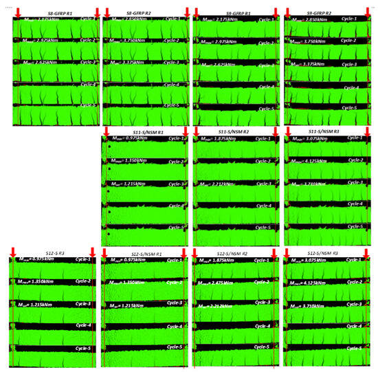 Figure 6 demonstrates the crack propagation of several selected beam samples during the five load cycles corresponding to succeeding load repetitions (R1, R2, R3, etc.) captured with the DIC system. However, these cracking results could only qualitatively illustrate the composite performance of the reinforcement system in involving the tension concrete resisting the load. Thus, the number of cracks (in the post-cracking stage) could reveal the tension-stiffening effect [49]. Remarkably, the proposed setup produces multiple cracks in the 600 mm long pure-bending zone, which makes it suitable for the tension-stiffening analysis using the smeared crack model, e.g., as described in reference [38].