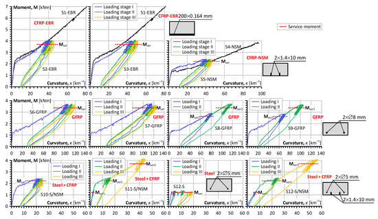 Table 3 shows the residual deformations (curvatures) determined for all samples subjected to unloading repetitions. These values are mandatory for adequate analysis when the mechanical load, necessary to estimate the residual stiffness of the beam sample, describes the consequential shift of the moment–curvature diagrams after reloading cycles (Figure 3). Thus, Table 3 determines the essential outcome valuable for further analysis and the modeling of the composite reinforcement systems similar to those considered in this work.