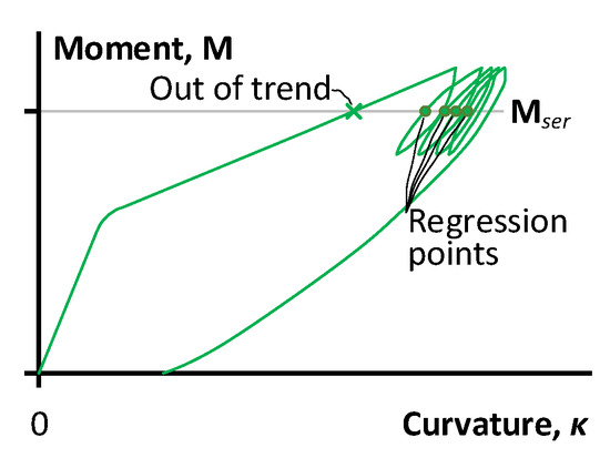 The schematic in Figure 9 illustrates the situation when the first branch of the moment–curvature diagram does not generate the data point for determining the trend line of the stress degradation because of the essential difference in the element stiffness before and after the load cycles. The inclusion of such exceptional results will corrupt the stiffness trends. Therefore, only four data points (except for the first loading point) are employed for the residual strength regression analysis.