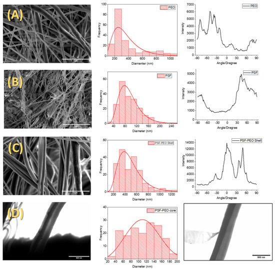 Images, distribution diameters, and fibrous orientation of materials obtained from PEO (A), PSF (B), bicomponent fibers (C) obtained with FESEM, and internal structure of bicomponent fibers (D) obtained with FESTEM.