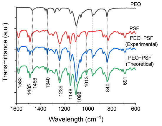 FTIR spectra of fibrous materials of PEO, PSF, and PEO-PSF.