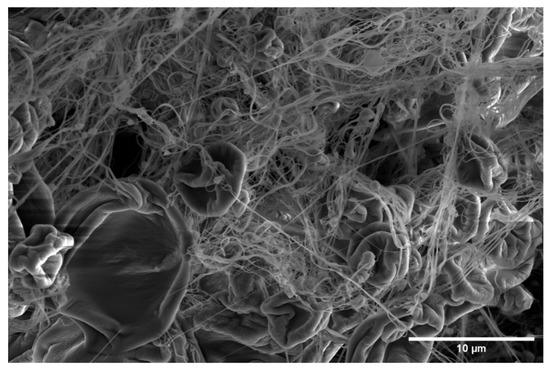 In particular, complete fibrillar morphology was observed on PEO material with a median diameter of 277 ± 70 nm (Figure 2A). PEO diameter fabricated with SBS was smaller than reported by others produced with a commercial airbrush [6]. Perhaps a stable region of low pressure was formed due to the controlled flow rate, causing a reduction in the fiber diameter as reported [21,22,23]. On the other hand, SBS fibers produced with the same concentration using a short working distance (15 cm) showed high diameters [24], which could be attributed to insufficient stretching of dissolution to the collector. Finally, SBS fibers with the same diameter were produced using a low concentration (6%) and short work distance (15 cm) [25]; the formation of fibers with the same diameter can be explained by the boiling point of the solvents used. Although the boiling point of dichloromethane is lower than that of chloroform/acetone, the evaporation rate of dichloromethane could explain the fiber formation in short work distances and low concentrations, allowing an adequate stretching of dissolution.