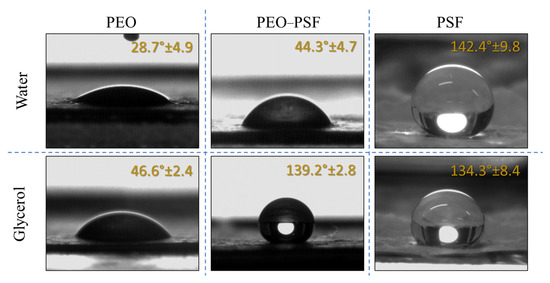 Images of test liquid drops and contact angles obtained on PEO, PEO-PSF, and PSF fibrillar materials fabricated by SBS.