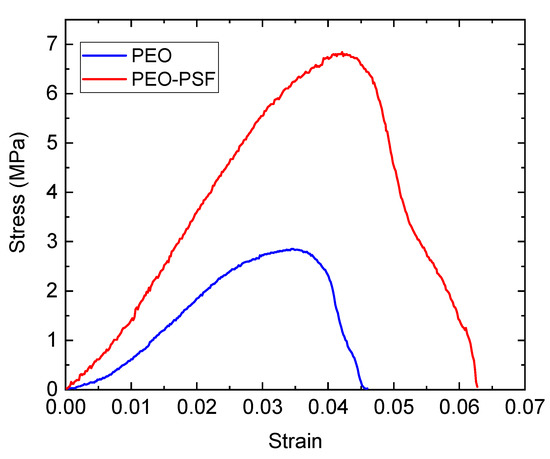 Figure 7 shows the stress–strain curves for PEO and bicomponent PSF-PEO materials obtained by SBS. Tensile tests of SBS neat PSF materials could not be carried out because of a lack of mechanical consistency in the prepared specimens to be tested. The reason is that relatively short fibers of PSF can be obtained from SBS, avoiding the possibility of entanglements, thus allowing the required mechanical consistency. Moreover, PSF is a quite rigid and brittle material that, together with its presence in the form of thin fibers, must lead to even poorer mechanical consistency.