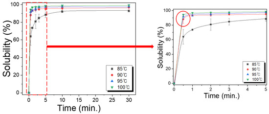 Figure 1 shows the solubility of the extracted sericin solid in water at different temperatures at various times. As is evident, the solubility of the extracted sericin increased remarkably until 1 min and then plateaus. Further, the solubility increased with an increase in the dissolution temperature. At a dissolution temperature of 85 °C, the solubility reached 73.6% at a dissolution time of 1 min. Thereafter, it reached 88.4% and 92.7% at 5 and 30 min, respectively. However, at a temperature of 90 °C, the solubility rose to 93.3% at 1 min, reaching 95.1% at 5 min. A further increase in the dissolution temperature exhibited a minimal change in the solubility, although it increased slightly with the dissolution temperature. This result, indicating that more than 90% of the extracted sericin could be dissolved at 90 °C and for a time greater than 1 min, is highly encouraging. However, the occurrence of hydrolytic molecular decomposition of silk sericin in hot water decreased the MW and the deterioration of the mechanical properties of sericin [20,21]. This implies that the increase in dissolution temperature and time may result in the deterioration of the sericin molecules. At a temperature of 85 °C, more than 10 min were required to reach a sericin solubility of 90%. However, at temperatures of 95 °C and 100 °C, the solubilities of the extracted sericin were similar to that at 90 °C. Therefore, 90 °C was selected as the dissolution temperature for all subsequent examinations.
