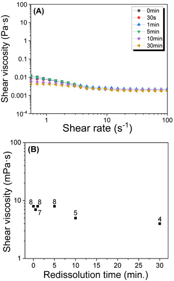 (A) Steady-state flow and (B) shear viscosity at 1 s−1 of 0.3% (w/w) silk sericin/formic acid solutions prepared by redissolution at 90 °C at different times.