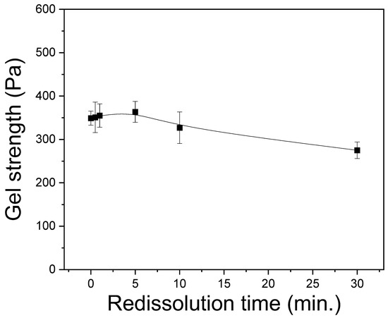 The gelation of the sericin solution follows the mechanism of three-dimensional (3D) network structure formation through the intermolecular hydrogen bonding between the sericin molecules [14,25]. As the length of the molecular chain (i.e., MW) of sericin decreases, the three-dimensional network structure becomes weaker, resulting in a decrease in gel strength [21]. Thus, the gel strength of sericin has a good correlation with its MW. Therefore, to reconfirm the MW change in sericin according to the dissolution time, the gel strength of silk sericin at different dissolution times was measured, and the results are exhibited in Figure 3. The sericin gels yielded a gel strength of 349–363 Pa until a dissolution time of 5 min. Thereafter, the gel strength decreased to 275 Pa with an increase in the dissolution time of up to 30 min. This trend is the same as that of the solution viscosity of sericin, as shown in Figure 2. Thus, this result reconfirmed that the MW of extracted sericin experienced minimal change until a dissolution time of 5 min, following which it decreased with a further increase in dissolution time.