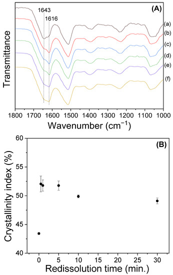 This study examined the molecular conformation and crystallinity index of the redissolved sericin film using FTIR spectroscopy, as can be seen in Figure 4. All sericin films showed an IR absorption peak at 1643 and 1616 cm−1, owing to the random coil and β-sheet crystallite, respectively [21,26]. In the case of the extracted sericin film (Figure 4A), the infrared (IR) absorption peak at 1643 cm−1 was stronger than that at 1616 cm−1, indicating that random coil conformation dominated in this sample rather than β-sheet conformation. However, the redissolved sericin films yielded a stronger peak at 1616 cm−1, implying that β-sheet conformation prevailed in these samples. With an increase in the dissolution time to 10 and 30 min, the IR peak at 1616 cm−1 became less evident, indicating the decrease in the β-sheet conformation content. The crystallinity index for silk protein [39,40,41] has been extensively utilized to quantitatively investigate the content of molecular conformations in silk proteins. This is because it can be calculated easily and shows a good correlation with the proportion of molecular conformation of silk obtained via deconvolution of the FTIR spectrum [21,42,43].