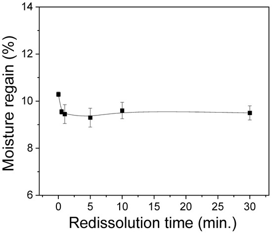 Water absorption capacity (or hydrophilicity) are one of important properties of biomedical and cosmetic materials, as it is required for facial mask packs and wound dressing [44]. Therefore, the moisture regain of the silk sericin films was evaluated, and the results are shown in Figure 5. The extracted sericin film (i.e., 0 min) yielded a moisture regain of 10.3%. Following dissolution, the redissolved sericin films showed a moisture regain range of 9–10%. The slight decrease in the moisture regain of the redissolved sericin films compared to the extracted sericin films can be attributed to their higher crystallinities. It has been reported that the moisture regain of silk proteins exhibits a negative correlation with their crystallinity [21,25,37].