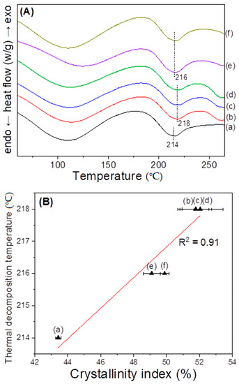 (A) DSC thermograms and (B) the effect of thermal decomposition temperature on the crystallinity index of silk sericin powder prepared by redissolution at 90 °C at different times: (a) 0 min, (b) 30 s, (c) 1 min, (d) 5 min, (e) 10 min, and (f) 30 min (n = 7).