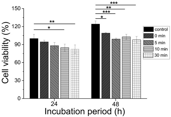 Cell viability of the silk sericin prepared by redissolution at 90 °C at different dissolution times (* p < 0.05, ** p < 0.01, *** p < 0.001/n = 3).