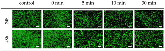Fluorescence images of the cell viability assay of the silk sericin prepared by redissolution at 90 °C at different times. The white scale bars represent 200 µm.