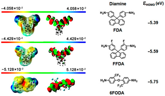 Two alicyclic dianhydrides with different steric structures, ccHPMDA and ctHPMDA, were used for the development of low-Rth and high-Tg CPI films in the current work. These series of hydrogenated pyromellitic dianhydrides (HPMDA) or cyclohexane dianhydrides (CHDA) have been thoroughly studied in Hasegawa’s pioneering works [29,30,31], and the effects of stereoisomerism in the dianhydride on the polymerization reactivity and properties of the derived polymers have been revealed. Among the seven stereoisomers of HPMDA dianhydride revealed up to now [32], three species, including 1S,2R,4S,5R-HPMDA (H-PMDA or ccHPMDA), 1S,2S,4R,5R-HPMDA (H′-PMDA or ttHPMDA), and 1R,2S,4S,5R-HPMDA (H″-PMDA or ctHPMDA), have now been investigated as monomers in the research and development of high-performance PIs. It has been concluded that the stereoisomerism in the dianhydrides indeed affects the thermal and optical properties of the afforded PIs. Meanwhile, the polymerization reactivities of the different HPMDA dianhydrides are not only dependent on the steric structures of the dianhydrides, but also on the characteristics of the diamine monomers used. In the current work, the potential polymerization reactivities of the dianhydride and diamine monomers were roughly compared via theoretical simulation. The reactivity of the monomers was calculated according to the density functional theory (DFT)/B3LYP methods with Gaussian 09 software using the 6–311 G (d, p) basis set [33]. The lowest unoccupied molecular orbital (LUMO) energy levels (εLUMO) for the HPMDA dianhydrides and the highest occupied molecular orbital (HOMO) energy levels (εHOMO) for the fluorene-containing or 6FODA diamines were calculated, and the results are shown in Figure 1 and Figure 2, respectively. It was reported in the literature that the εLUMO value of one dianhydride and the εHOMO value of one diamine were closely related with their polymerization reactivity. A lower εLUMO value for the dianhydride and a higher εHOMO value for the diamine could roughly indicate the higher reactivity of the monomers [34]. According to Figure 1, H′-PMDA (ttHPMDA) with the lowest εLUMO value (−1.81 eV) might possess the highest reactivity among the three stereoisomers, which is in good agreement with the literature [31]. The reactivities of the three compounds decreased in the order of H′-PMDA (ttHPMDA) > H″-PMDA (ctHPMDA) > H-PMDA (ccHPMDA). With the same simulation procedure, the aromatic pyromellic dianhydride (PMDA) showed the εLUMO value of −4.17 eV, indicating a much higher polymerization reactivity than those of the alicyclic HPMDA. Thus, a high-temperature polycondensation procedure might be needed for the HPMDA-based PIs. As for the diamines, the reactivities of the three monomers decreased in the order of FDA (−5.39 eV) > FFDA (−5.59 eV) > 6FODA (−5.75 eV), according to the εHOMO values. These values are a bit lower than that of the common aromatic diamine of 4,4′-oxydianiline (ODA) (εHOMO = −5.08 eV), indicating the inferior reactivities of the fluorene-containing and fluoro-containing diamines. In the current work, ccHPMDA and ctHPMDA were chosen to polymerize with the three aromatic diamines, respectively.