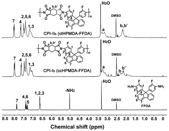 The chemical structures of the CPI resins were confirmed by the 1H-NMR measurements and the spectra of the resins based on FDA and FFDA, and these, together with the assignments of every hydrogen proton, are shown in Figure 5 and Figure 6, respectively. Taking the CPI resins based on FDA as an example (Figure 5), it can be clearly observed that the characteristic absorption of the proton in –NH2 at 4.92 ppm completely disappeared in the spectra of the CPI resins. For the spectra of the polymers, the hydrogen proton absorptions were clearly divided into two parts, including the ones caused by the aromatic rings at the downfield areas and the ones due to the alicyclic rings at the upfield areas. The absorptions of H6 in the fluorene units appeared furthest downfield in the spectra. For the spectra of the ccHPMDA-based CPI-Ia and the ctHPMDA-based CPI-IIa, the most obvious difference was the absorptions of Hb and Hb’. For the ccHPMDA system, the Hb and Hb’ protons exhibited split absorptions in the chemical shift range of 1.85~2.28 ppm, which might be due to the simultaneous actions of the two electron-withdrawing imide carbonyl groups. For the ctHPMDA system, the absorptions of Hb and Hb’ protons overlapped, indicating the relatively weak effects of the two carbonyl groups. This is in good agreement with the structural features of the ctHPMDA dianhydride, in which the two imide rings showed opposite steric structures. For the CPI resins based on FFDA, the 1H-NMR spectra (Figure 6) revealed similar structural information. The information confirmed the successful preparation of the targeted CPI resins.