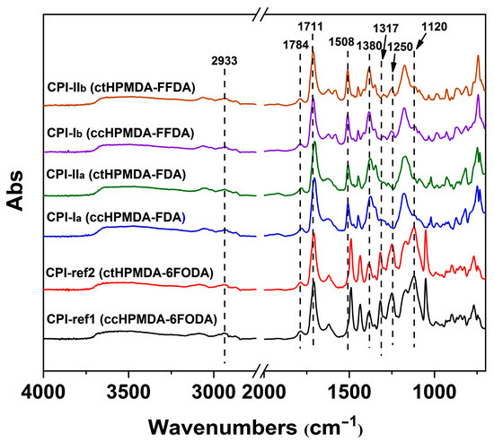 The chemical structures of the CPI films were further identified by FTIR measurements, as shown in Figure 8. Unlike the significantly different absorption peaks seen in the 1H-NMR spectra (Figure 5 and Figure 6) between the ccHPMDA-based and CtHPMDA-based PIs, a difference in absorption peaks due to the stereoisomerism of the structures was not observed in the FTIR spectra. All the polymers showed similar absorptions due to the similar chemical compositions. The similar parts include the characteristic absorptions of imide rings at ~1780 cm−1, ascribed to the asymmetrical carbonyl stretching vibrations, at ~1711 cm−1 due to the symmetrical carbonyl stretching vibrations, at ~1380 cm−1 caused by the C–N stretching vibrations, at 1508 cm−1 due to the stretching vibration of C=C in benzene rings in the diamine units, and at ~2933 cm−1 from the saturated C–H (–CH2–) absorptions in the dianhydride units. The differences mainly relate to the characteristic absorptions at ~1317 cm−1 due to the asymmetrical stretching of C–F bonds in –CF3 groups, and at 1120 cm−1 due to the –O– linkages, which were only detected in the spectra of the CPI-ref1 and CPI-ref2 polymers. In addition, symmetrical C–F stretching vibrations at ~1250 cm−1 were detected in the spectra of both the 6FODA-based CPI films and the FFDA-derived CPI films. The revealed structural features are highly consistent with those of the targeted CPI films.