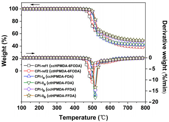 The fluorene-based polymers are well known for their high thermal stability due to the fused aromatic rings. Thus, it can be anticipated that the incorporation of the fluorene components into the thermally sensitive semi-alicyclic PIs might efficiently increase the thermal resistance of the derived polymers. First, the thermal decomposition behaviors of the CPI films were investigated by TGA and DTG tests, and the results are presented in Figure 9 and Table 3, respectively. It could be deduced from the Figure that all the CPI films maintained their initial weights before 450 °C, after which they began to decompose and showed 5% weight loss temperatures (T5%) in the range of 470.4~504.3 °C. The most rapid thermal decomposition occurred in the temperature range of 492.1~517.2 °C, and the films left 38.6~49.5 wt. % of their original weights at 750 °C in nitrogen. Basically, the FFDA-based CPI films exhibited the best thermal stability and the 6FODA-based CPI films showed the worst. For example, CPI-IIb (ctHPMDA-FFDA) showed T5% and residual weight ratio at 750 °C (Rw750) values of 504.3 °C and 49.5 wt. %, which are obviously higher than those related to CPI-ref2 (ctHPMDA-6FODA, T5% = 480.6 °C; Rw750 = 38.6 wt. %). This might be due to the higher aromatic ring contents in the fluorene-derived CPI films.
