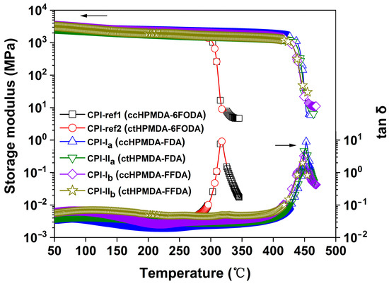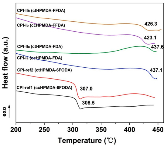 The glass transition temperatures (Tg) of the CPI films were determined by DSC and DMA tests, and the results are shown in Figure 10 and Figure 11 and Table 4, respectively. According to the DSC plots shown in Figure 10, the CPI films exhibited clear glass transition behaviors in the tests. The fluorene-based CPI films showed Tg values that were more than 100 °C higher than those of the 6FODA-based ones. For example, the CPI-Ia (ccHPMDA-FDA) film had a Tg value of 437.1 °C, which is 128.6 °C higher than that of the analogous CPI-ref1 (ccHPMDA-6FODA) (Tg = 308.5 °C). The high-Tg feature of the fluorene-containing CPI films is mainly due to the non-planar structures in the FDA and FFDA diamine moieties caused by the bulky and rigid fluorene units, which efficiently increased the barrier against the free rotations and movements of the molecular chains at elevated temperatures. With respect to the effects of the stereoisomerism of the dianhydrides on the Tg values of the polymers, no obvious differences were observed for the ccHPMDA- and ctHPMDA-derived CPIs in the DSC measurements. Similar results were also observed in the DMA measurements, as shown in Figure 11. The Tg values of the polymers were identified as the peak temperatures of the tan δ plots. The fluorene-based CPI films exhibited Tg values in the range of 446.0~453.2 °C, which were also obviously higher than those of the 6FODA-based polymers (Tg ≈ 317 °C). In addition, the fluorene-containing CPI films could maintain most of their initial storage modulus up to 400 °C, while the modulus of the 6FODA-derived ones dramatically dropped when the temperature was higher than 300 °C. This also reflects the superior thermal stability of the former polymers.