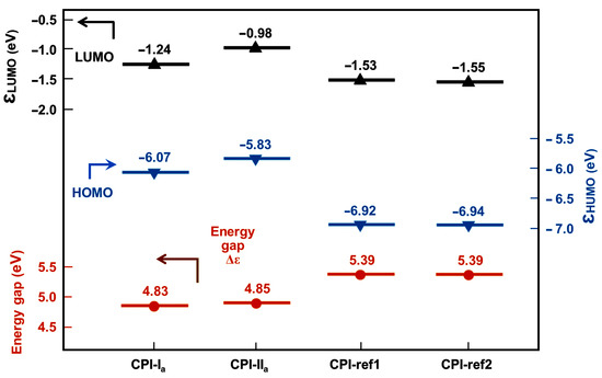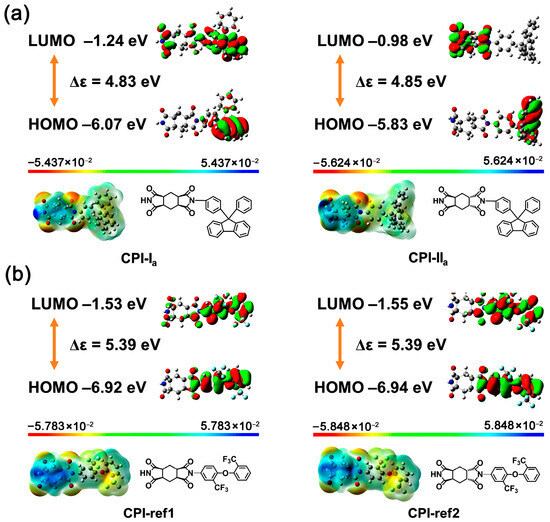 First, the appearances of the developed fluorene-containing and referenced CPI films are shown in Figure 13. All the CPI films exhibited very pale colors and good optical transparency. Figure 14 presents the UV-Vis spectra of the CPI films and the optical data are tabulated in Table 4. The CPI films showed UV cutoff wavelengths (λcut) in the range of 287~304 nm, indicating good optical transparency in the visible light region (wavelength: 400~760 nm). The optical transmittances of the CPI films at 400 nm (T400) and 450 nm (T450) were all higher than 80% at the thickness of 20 μm. Basically, the fluorine-containing 6FODA-PI films exhibited higher optical transmittances than those of the fluorene-PI counterparts. For example, the CPI-ref1 (ccHPMDA-6FODA) film showed a T400 value of 84.9%, which is higher than those of analogous CPI-Ia (ccHPMDA-FDA, T400 = 82.1%) and CPI-Ib (ccHPMDA-FFDA, T400 = 84.6%). In theory, the existence of the highly electronegative –CF3 groups efficiently reduced the charge transfer (CT) actions from the electron-donating diamine units to the electron-withdrawing dianhydride units, resulting in the prohibition of visible light absorption by the polymers. Meanwhile, the non-conjugated cyclohexane rings also caused a reduction in the CT effects. The CT interactions could be explained by calculating the frontier molecular orbital (MO) energies of the CPIs, as shown in Figure 15. The calculated εHOMO, εLUMO, and energy gap (Δε, |εHOMO − εLUMO|) values are shown in Figure 16. In the literature, both experimental and theoretical investigations of the PI films have proven that intra- and intermolecular CT with diamine to dianhydride moiety can play an important role in determining the ultraviolet absorption of PI films [37,38]. The Δε values of the CPI films could be used to roughly reflect the difficulties related to CT interactions within the molecular chains of the PIs. The larger this value is, the more difficult it will be for it to cause CT interactions. The Δε values of the CPI films increased in the order of CPI-Ia (4.83 eV) < CPI-IIa (4.85 eV) < CPI-ref1 (5.39 eV) = CPI − ref2 (5.39 eV). Thus, CPI-ref1 and CPI-ref2 showed the best optical transparency among the CPI systems.